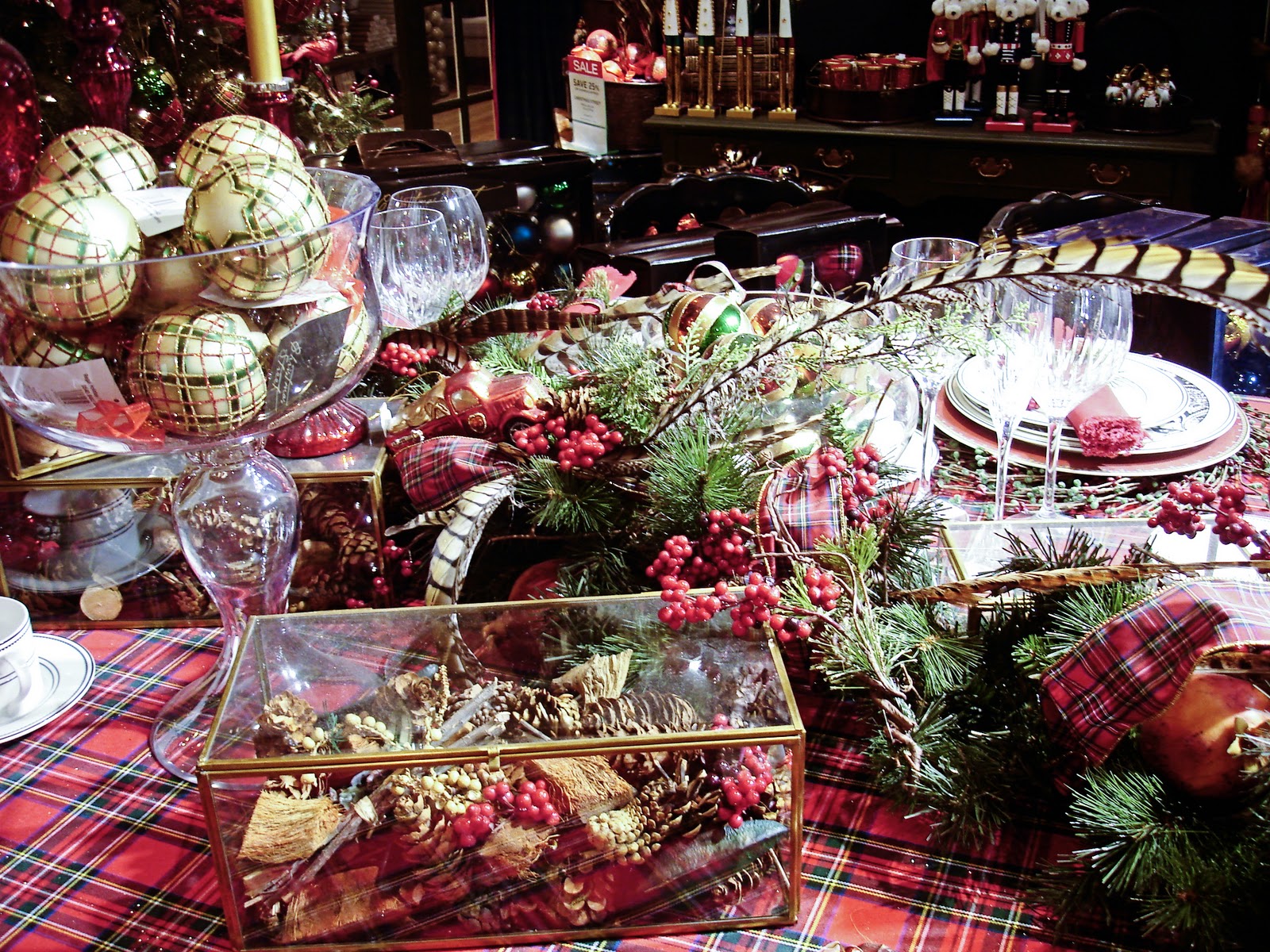 The metallic golds and sage greens of the Golden Glow collection were really pretty. I adored the sea glass ornaments and the faux magnolia wreaths which provided just the right hint of colour against the soft muted pearl ornaments.. The styling is this display was especially impressive. The oversized urn with Wedgewood detailing was just gorgeous and the yellow china worked so well with the tablescape.